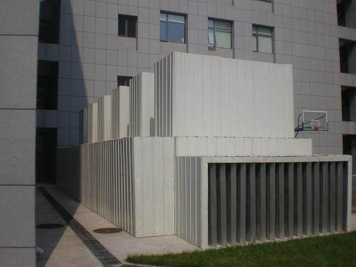 典型案例二:閉式冷卻塔噪音處理1.施工現(xiàn)場情況頂樓使用了閉式冷卻塔,閉式冷卻塔由11個制冷機組構(gòu)成,其排序東西方向,共三排。北邊距其主樓約35-45米為水商業(yè)樓;西邊30-40米為居民文化活動中心。考慮到閉式冷卻塔距離居民較近,距離辦公樓約35-45米;在閉式冷卻塔塔工作中時將形成噪音污染,2.秉著社會經(jīng)濟、有效性的基本原則,本公司明確提出下面冷卻塔噪聲處理方法:1)在閉式冷卻塔的東邊,距閉式冷卻塔2.3米、距東墻30厘米內(nèi)處安裝高六米的吸隔音屏障,隔音屏障長15.5米;2)在閉式冷卻塔的北邊的小墻上安裝隔音屏障,其屏障高度與東側(cè)的屏障頂端等高(屏障高約4.8米,長26米)。3)為有利鄰邊頂樓設(shè)備維護,在北邊隔音屏障的適當(dāng)位置安裝外形尺寸為2m*1m的隔音門。4)吸隔音屏障主體部分:外邊選用厚6mmFC實心板護面,內(nèi)鋪地厚80mm吸音棉,里面選用厚4mm,18%FC孔板護面。5)吸隔音屏障基礎(chǔ)部分:東邊選用混凝土基礎(chǔ),北邊直接使用吸隔音屏障。6)為了能夠減少建筑預(yù)算,與此同時提生吸隔音屏障有效性高度和美觀效果,在吸隔音屏障頂端改成內(nèi)傾式遮檐。
